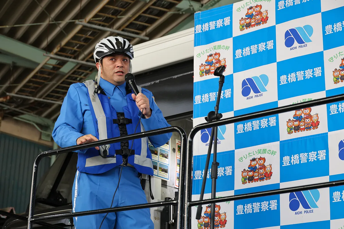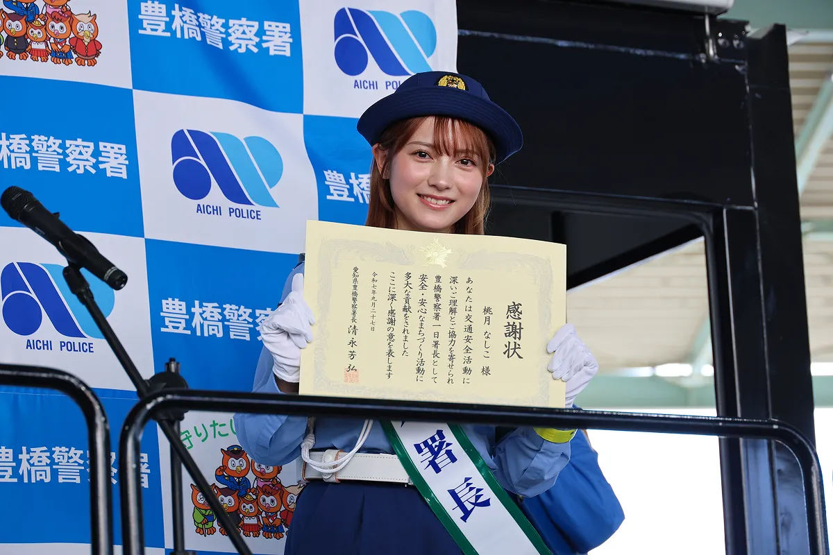当日は、豊橋市出身の女優・タレント「桃月なしこ」さんが一日警察署長としてご来場され、シミュレーターをご体験いただきました。